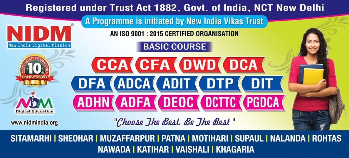 New India Digital Misssion is registered under a public trust act 1882, under NCT of New Delhi, Govt Of India. NIDM is an ISO certified company from U.K. Quality Control Certification and QCI Certified Organization.